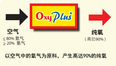 Oxy Plus ( 制氧机) 以空气为原料,产生高达90%的纯氧。